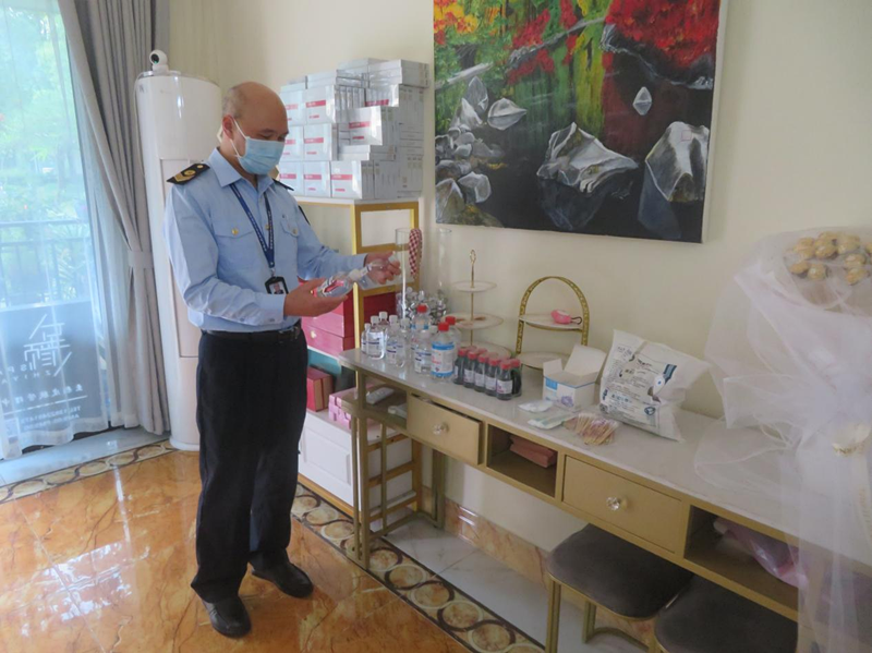 近日,市衛(wèi)生監(jiān)督所接群眾投訴舉報(bào),有人在某住宅小區(qū)開展針劑注射的醫(yī)療美容服務(wù),懷疑存在非法醫(yī)美行為,我所立即派出執(zhí)法人員到場開展檢查。經(jīng)核查,該地址為鶴山碧桂園天匯小區(qū)一居民住宅,大門口沒有懸掛招牌,大門口正上方、右側(cè)懸掛“祛斑、祛痰、祛黃、紋繡”的廣告,正前方懸掛有“美白祛斑”“無痕雙眼皮”“45°翹睫芭比眼”“媚眼術(shù)”等醫(yī)療美容廣告,在該場所內(nèi)查見稀洛因精華素、沒有中文標(biāo)識的美容產(chǎn)品、“嗨體”美容產(chǎn)品、已使用的針頭一批和顧客登記本等物品。