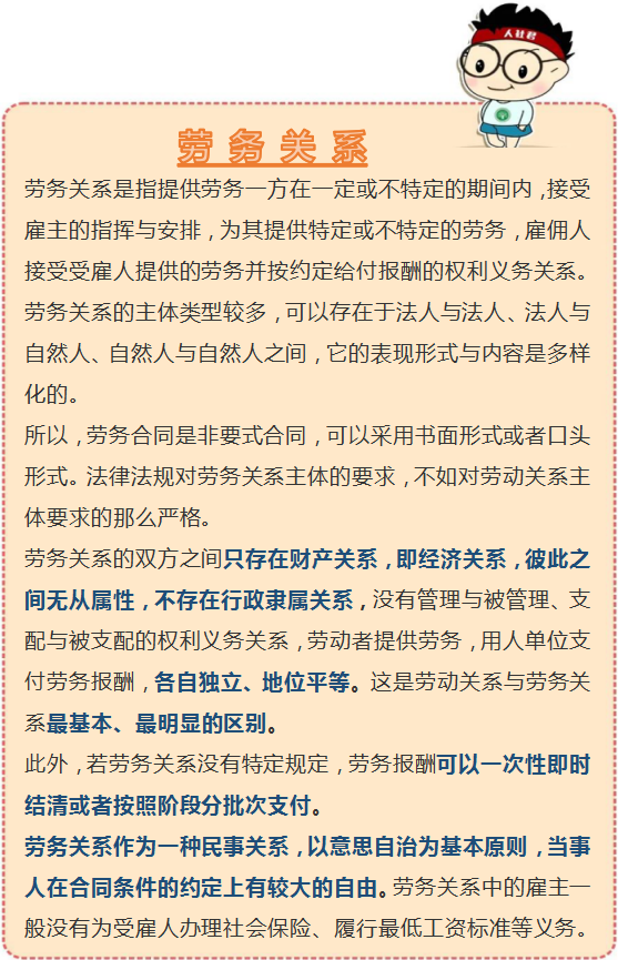 而勞務(wù)關(guān)系中,雙方是平等的民事權(quán)利義務(wù)關(guān)系,勞動(dòng)者提供勞務(wù),用人單位支付勞務(wù)報(bào)酬,彼此之間只體現(xiàn)財(cái)產(chǎn)關(guān)系,不存在行政隸屬關(guān)系。且二者關(guān)系往往呈“臨時(shí)性、短期性、一次性”等特點(diǎn)。