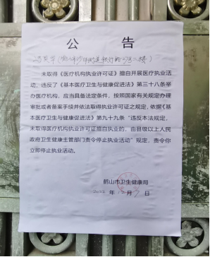 上圖:衛(wèi)監(jiān)執(zhí)法人員在該行醫(yī)場所大門口墻壁上張貼《公告》