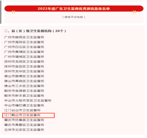 近日,廣東省衛(wèi)生監(jiān)督所通報表彰獲評2022年度廣東衛(wèi)生監(jiān)督優(yōu)秀通訊集體、優(yōu)秀通訊作品和全省衛(wèi)生行政處罰優(yōu)秀案例、典型案例。鶴山市衛(wèi)生監(jiān)督所榜上有名,雙喜臨門:該所被評為2022年度廣東衛(wèi)生監(jiān)督優(yōu)秀通訊集體、該所承辦的案件《某診所未按照疫情防控要求落實首診負責制且逾期不改案》評為2022年全省衛(wèi)生行政處罰典型案例。