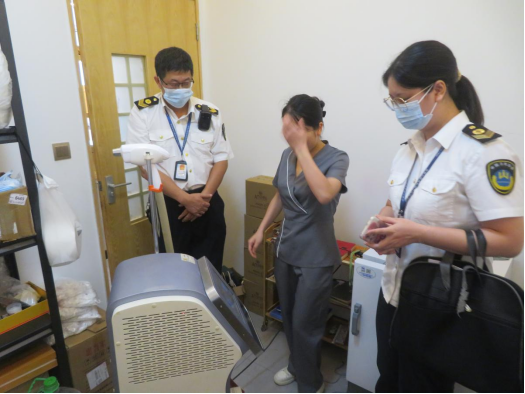 近日,我所接到群眾投訴舉報稱位于鶴山市沙坪街道保利中央花園二期的某美容中心為其開展冰點脫毛的醫(yī)療美容服務,造成了身體不適。市衛(wèi)生監(jiān)督所迅速組織執(zhí)法人員到場檢查,發(fā)現該場所其中一個房間內擺放有一臺開機屏幕顯示“808 Diode Laser”的器械,接待廳擺放了一臺iPad,里面記錄有顧客的服務記錄,服務項目為“OPT脫毛(腋下)”,服務次數為3次。經詢問調查,該美容中心管理者表示,開機屏幕顯示“808 Diode Laser”的器械是用于為顧客開展冰點脫毛項目的,并承認曾在該場所為顧客提供該項服務。