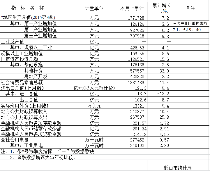 鶴山市2015年1-11月主要經(jīng)濟指標