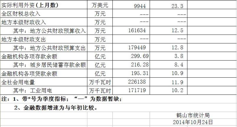 鶴山市2014年1-9月主要經(jīng)濟指標