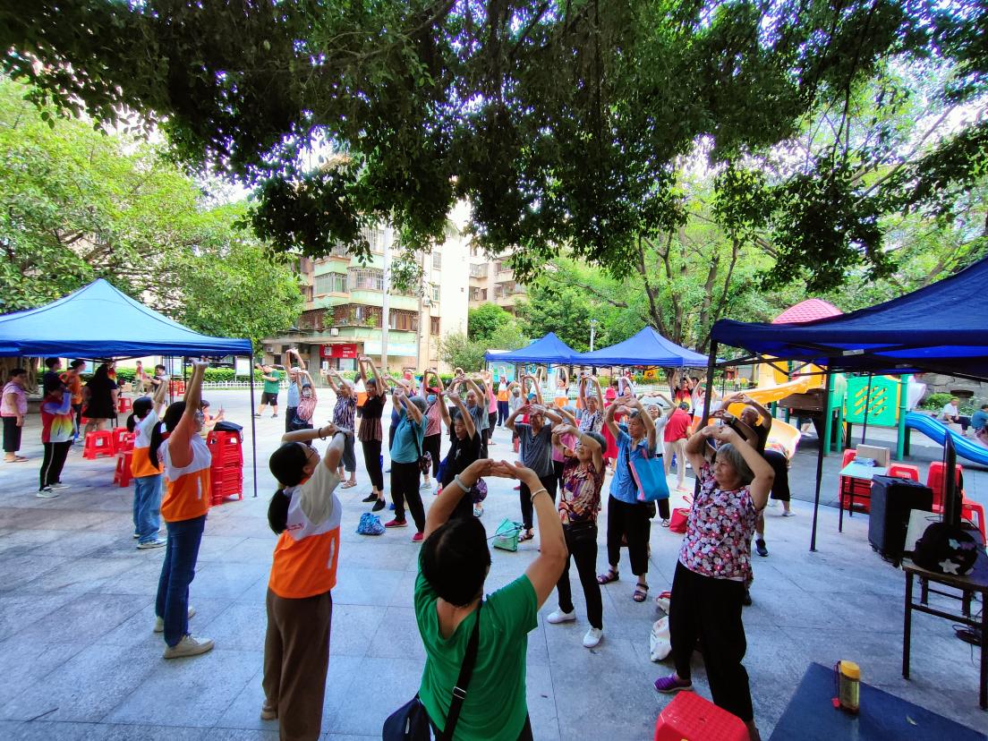 ▲新升社區(qū)居民在門前廣場學(xué)習(xí)八段錦