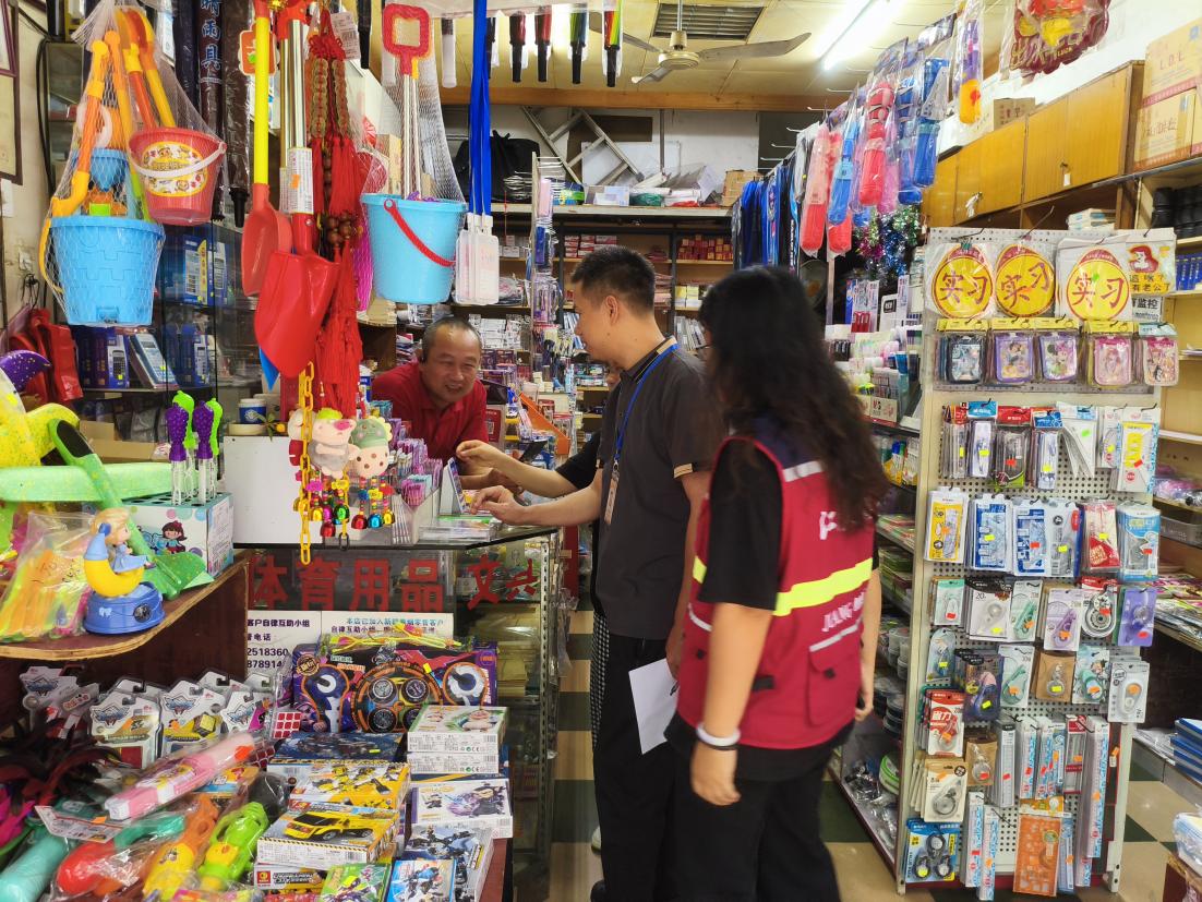 ▲新升社區(qū)網(wǎng)格員檢查文具店銷售的產(chǎn)品是否危害未成年人身心