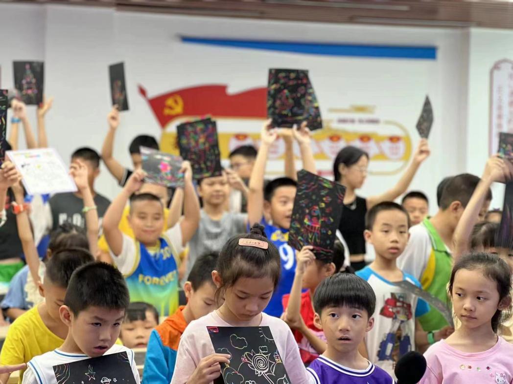 祥盛社區(qū)暑托班學生在結(jié)業(yè)展演上展示繪畫手工成果