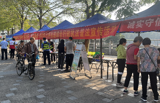 同時,執(zhí)法人員以轄區(qū)真實執(zhí)法案件為例,在活動現場“以案說法”,讓社區(qū)居民對行政執(zhí)法工作和相關法律法規(guī)有更加直觀深入的認知,提升居民群眾尊法、學法、守法、懂法、用法的意識。此外,活動還邀請了律師顧問來到現場為居民群眾面對面解答涉法疑問。本次活動共發(fā)放宣傳材料1000余份,接待咨詢群眾200余人次。