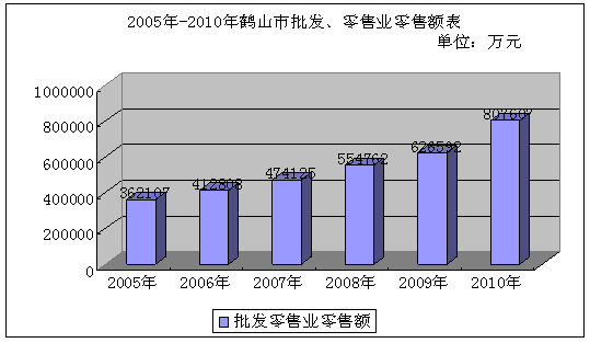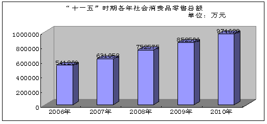 “十一五”時期,鶴山市經(jīng)濟(jì)社會持續(xù)快速健康發(fā)展,消費(fèi)品市場規(guī)模進(jìn)一步擴(kuò)大,市場繁榮活躍,供給貨源充足,商品豐富多樣,消費(fèi)熱點(diǎn)突出,流通總量擴(kuò)大,城鄉(xiāng)市場繁榮。消費(fèi)品市場保持持續(xù)快速增長態(tài)勢。